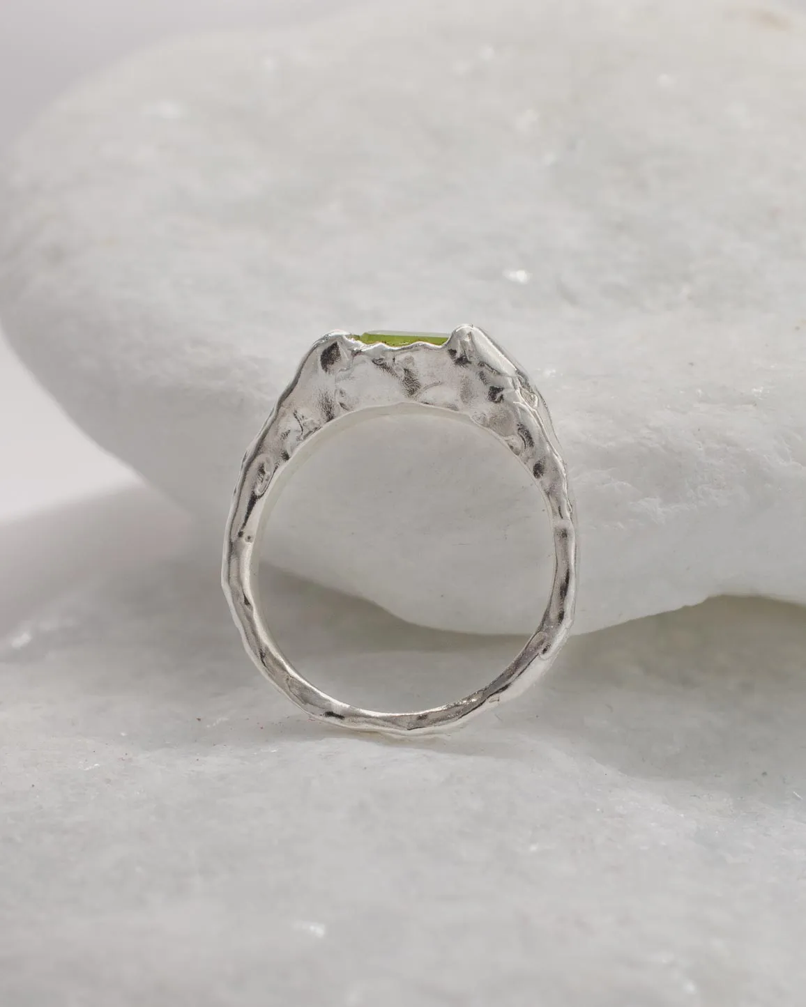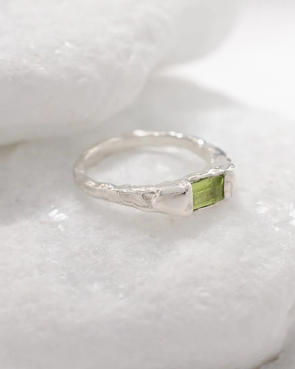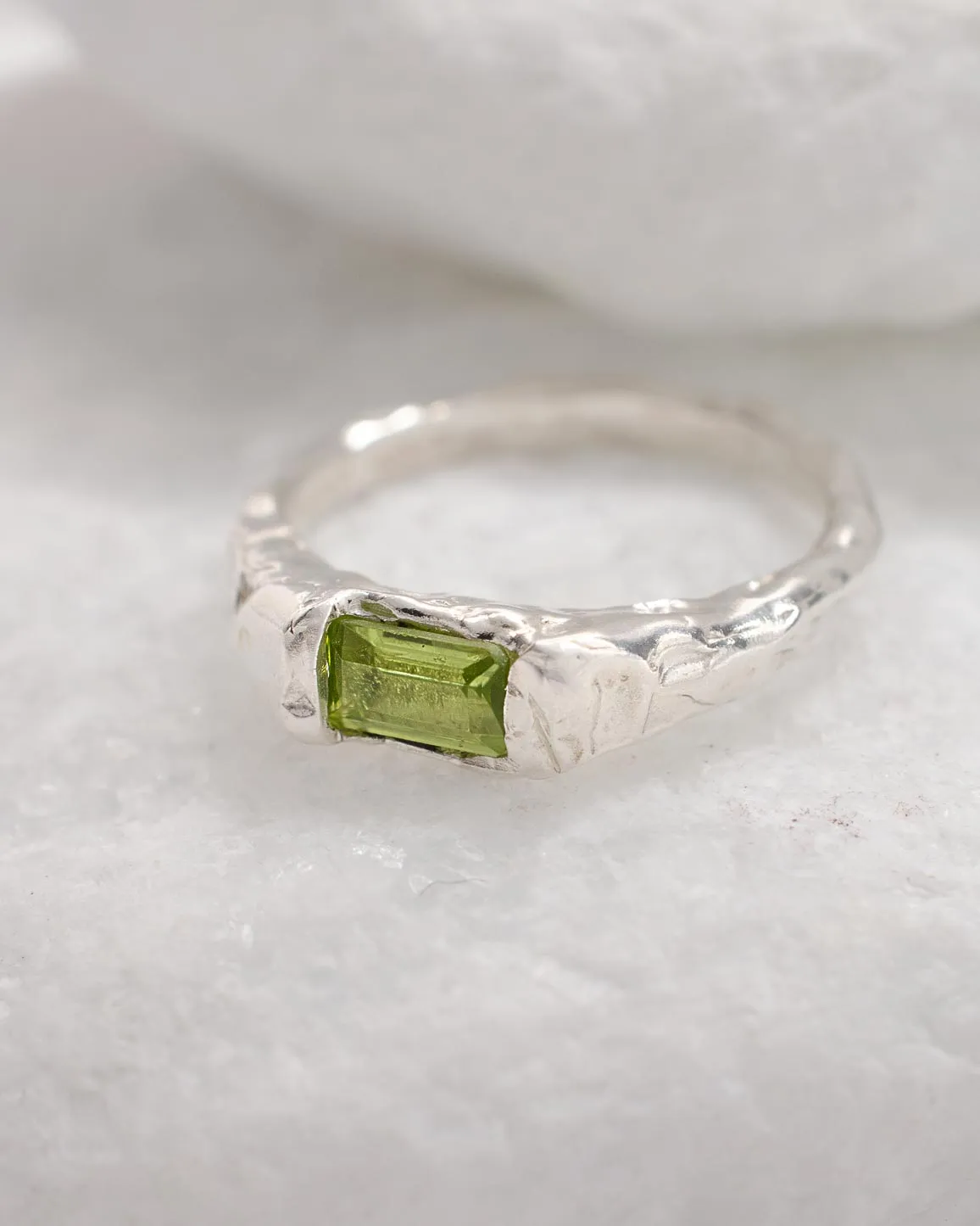 Anel anatômico em prata 950, modelado em cera com textura orgânica e pedra em lapidação baguete 5x3mm escolhida por você ou definida a partir da nossa leitura energética (após confirmado o seu pedido iremos entrar em contato para saber em relação sobre a pedra). Pensado para ser usado como anel de dedinho (ou em qualquer dedo que desejar).