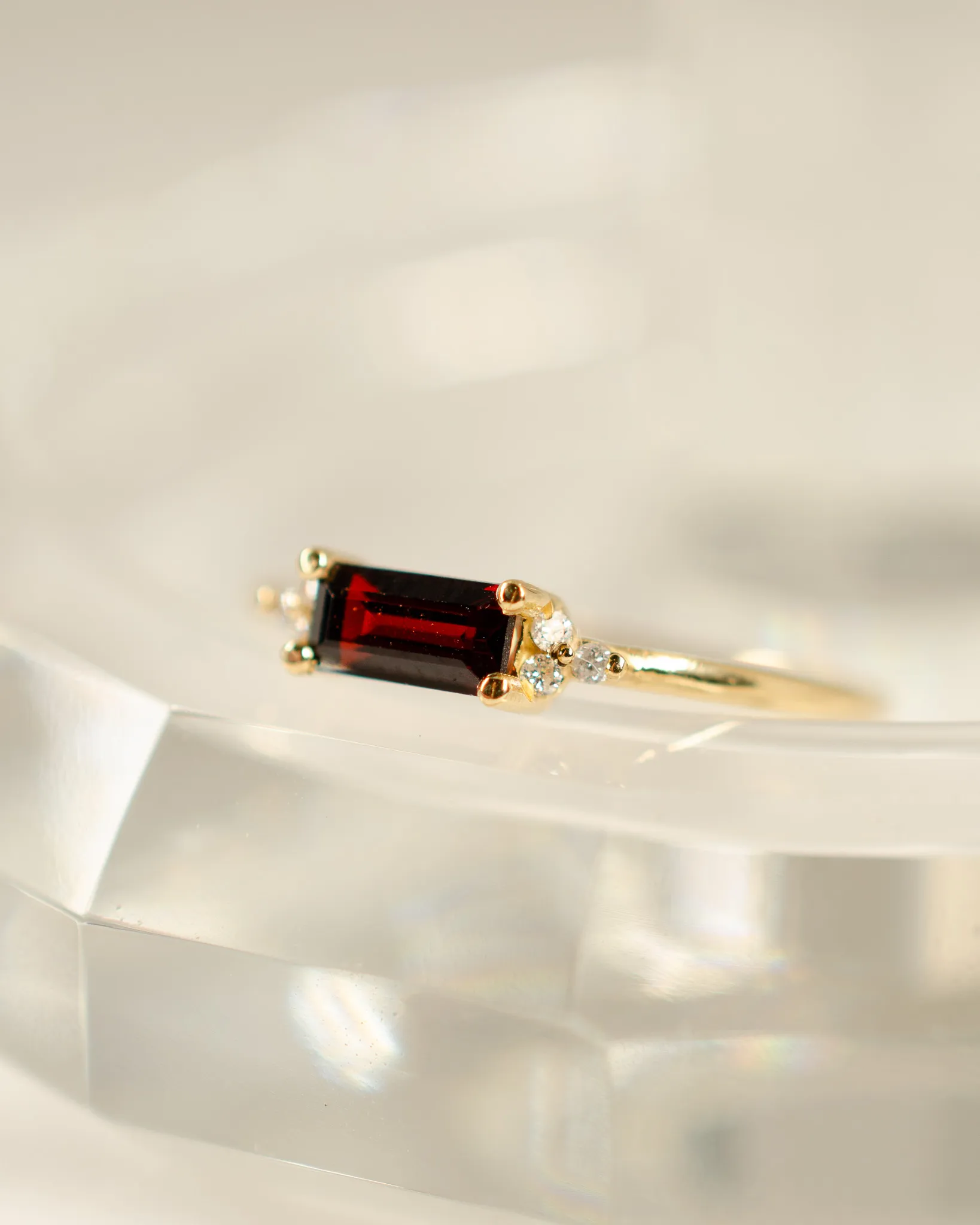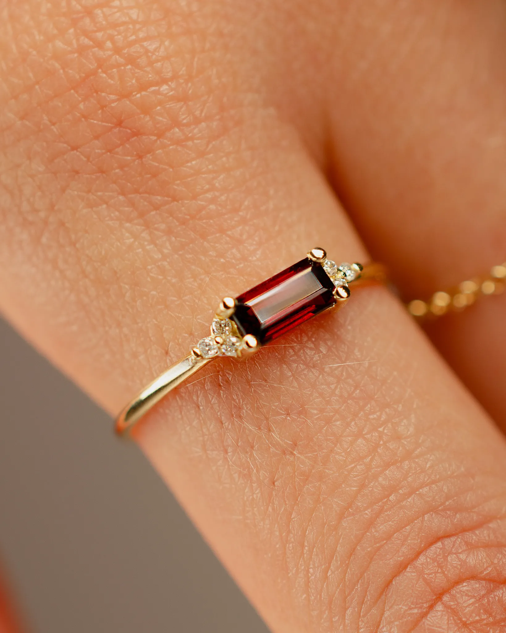 Anel em ouro 18k com seis diamantes de 0.6pts cada e granada em lapidação baguete.