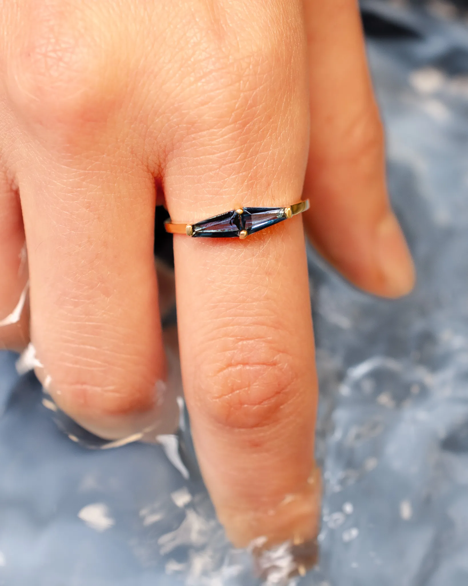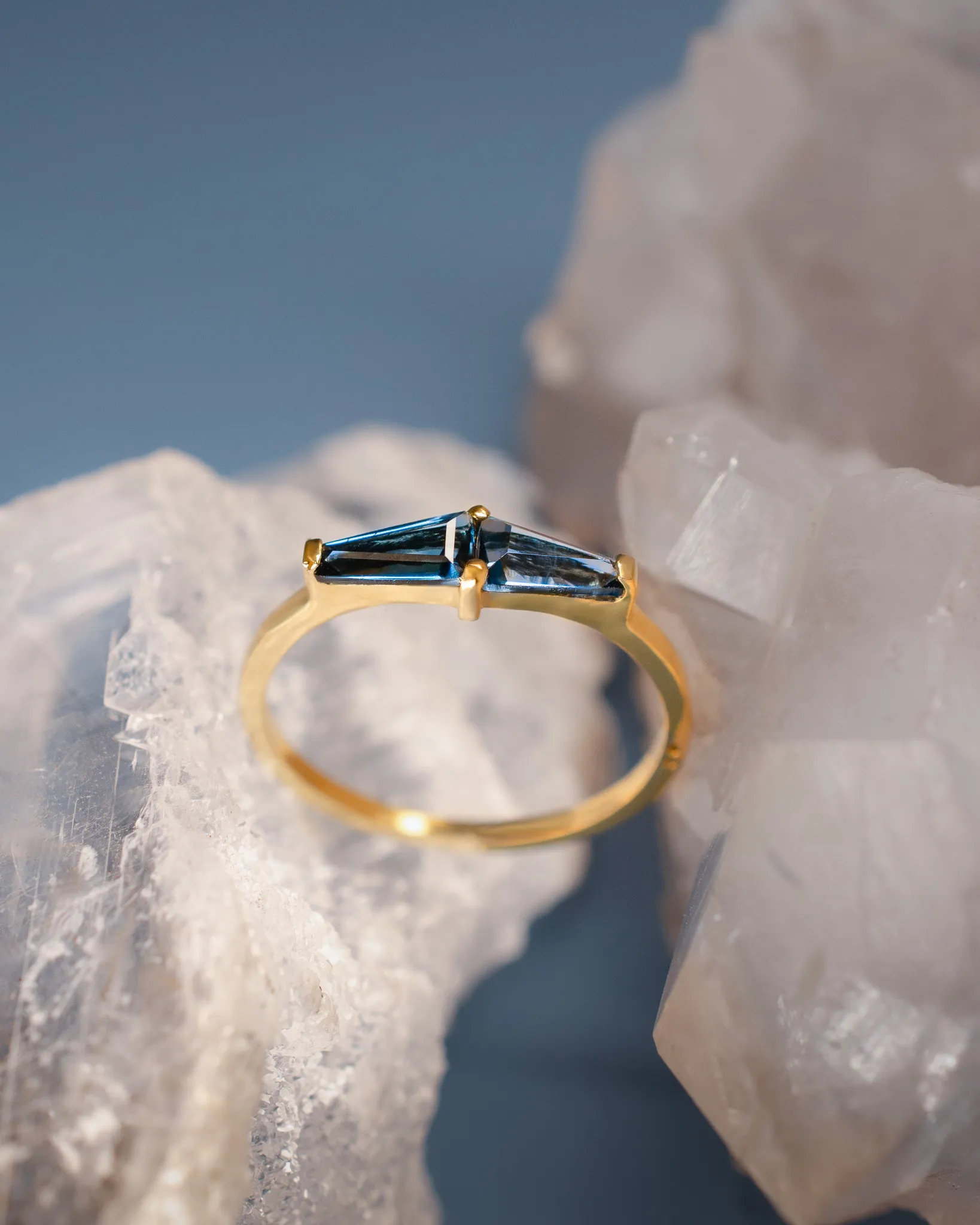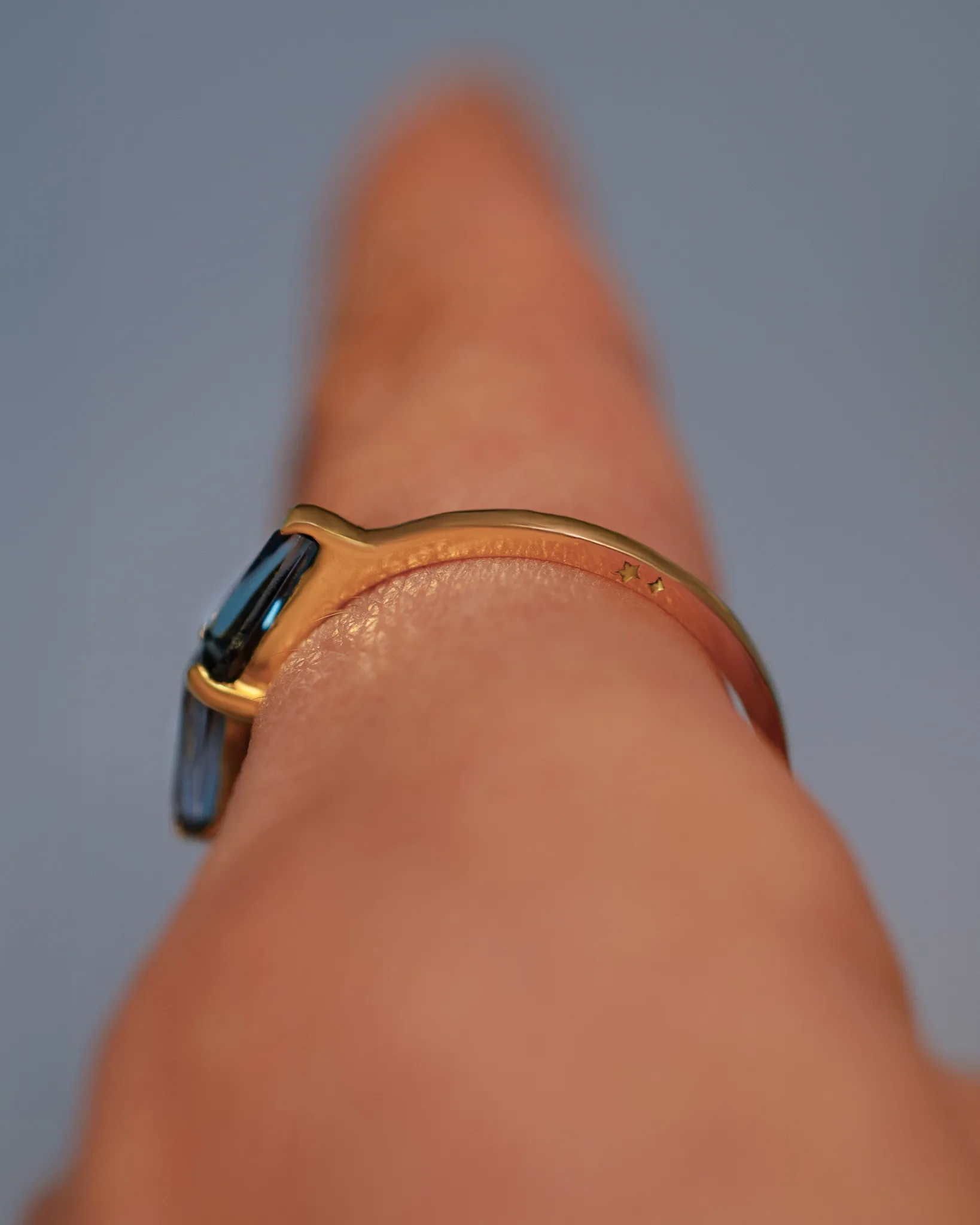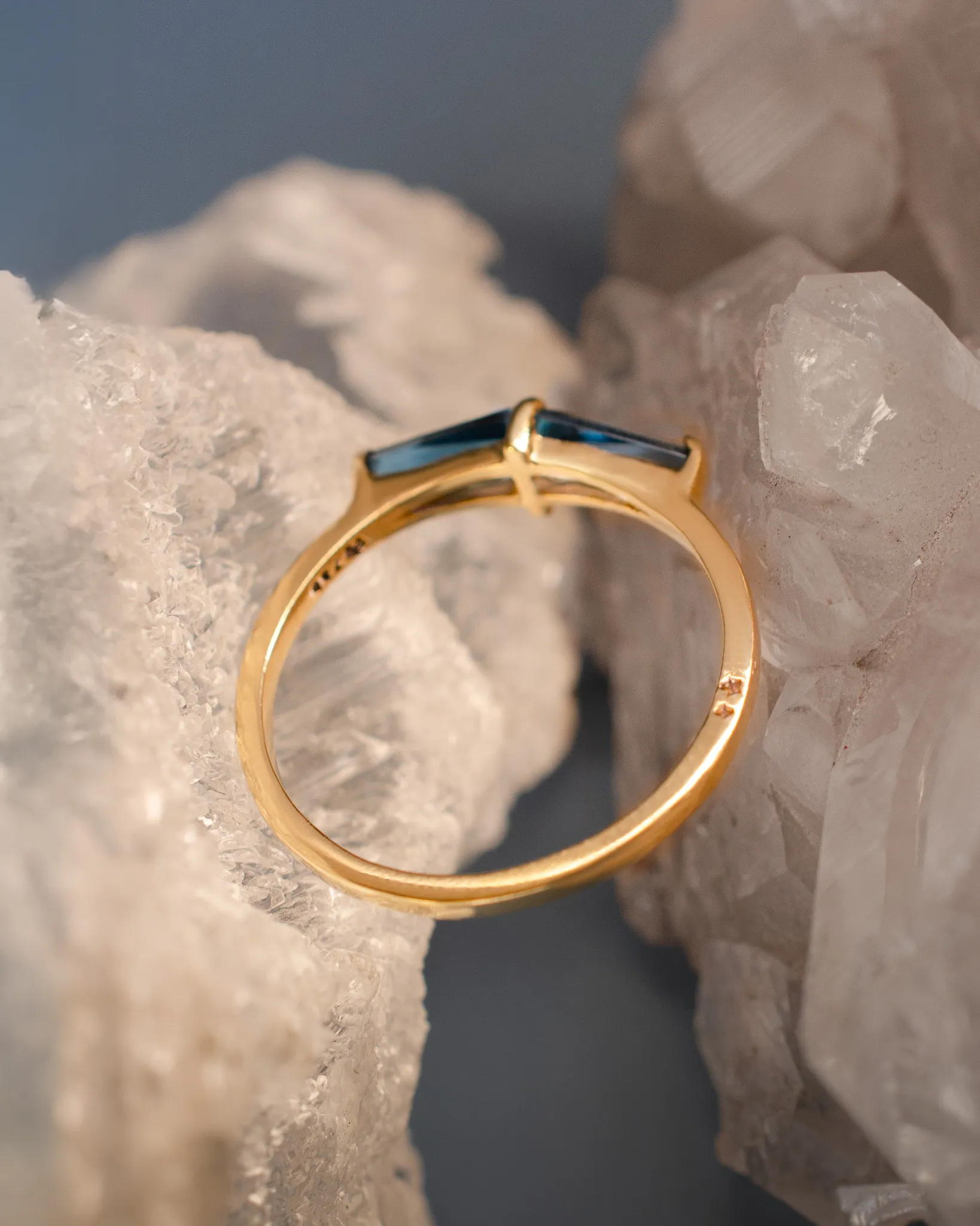 Anel em ouro amarelo 18k com topázio azul London, uma pedra conhecida pela profundidade do seu azul e pelo brilho que muda conforme a luz. O Shanti é um anel delicado, confortável e pensado para o dia a dia.