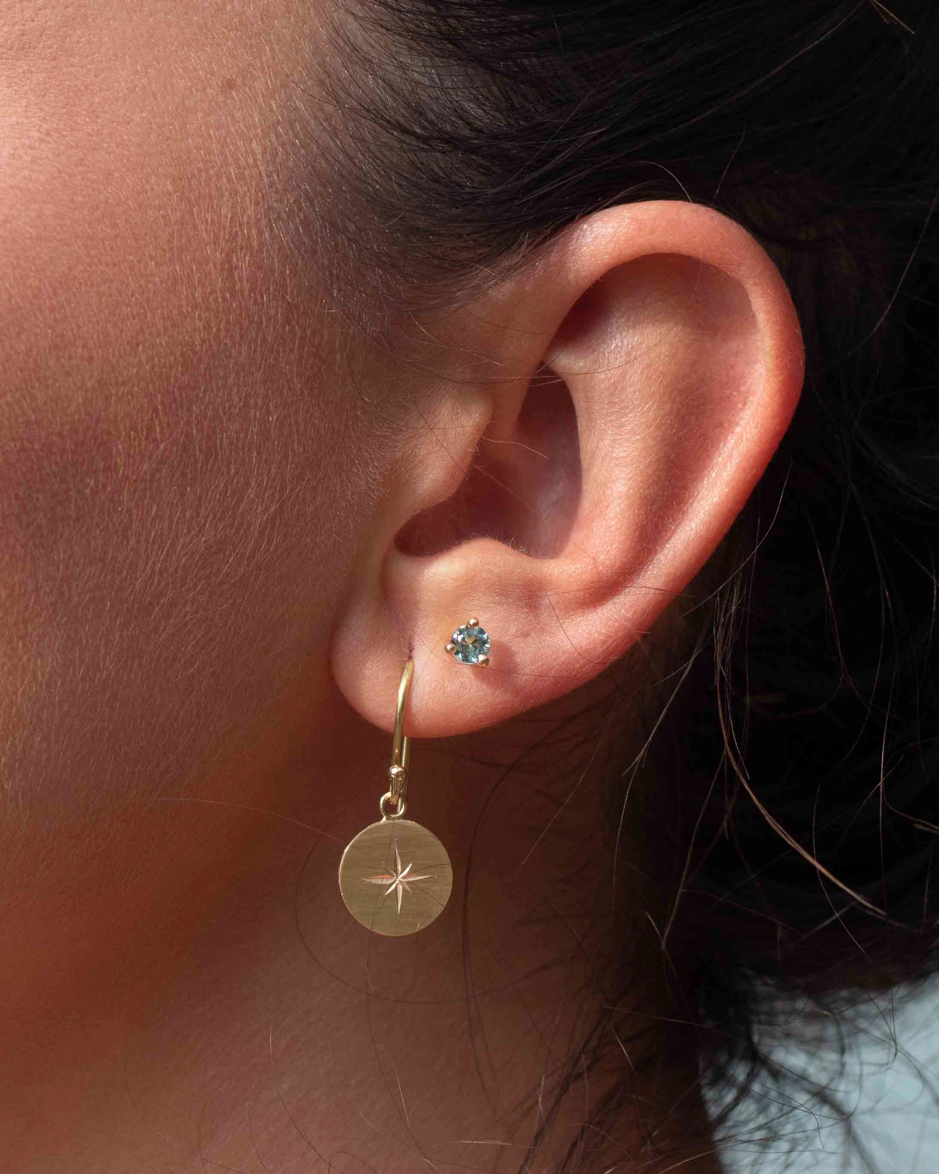 O brinco traz a Estrela Guia gravada ao centro, à altura dos ouvidos, instigando à percepção intrínseca.