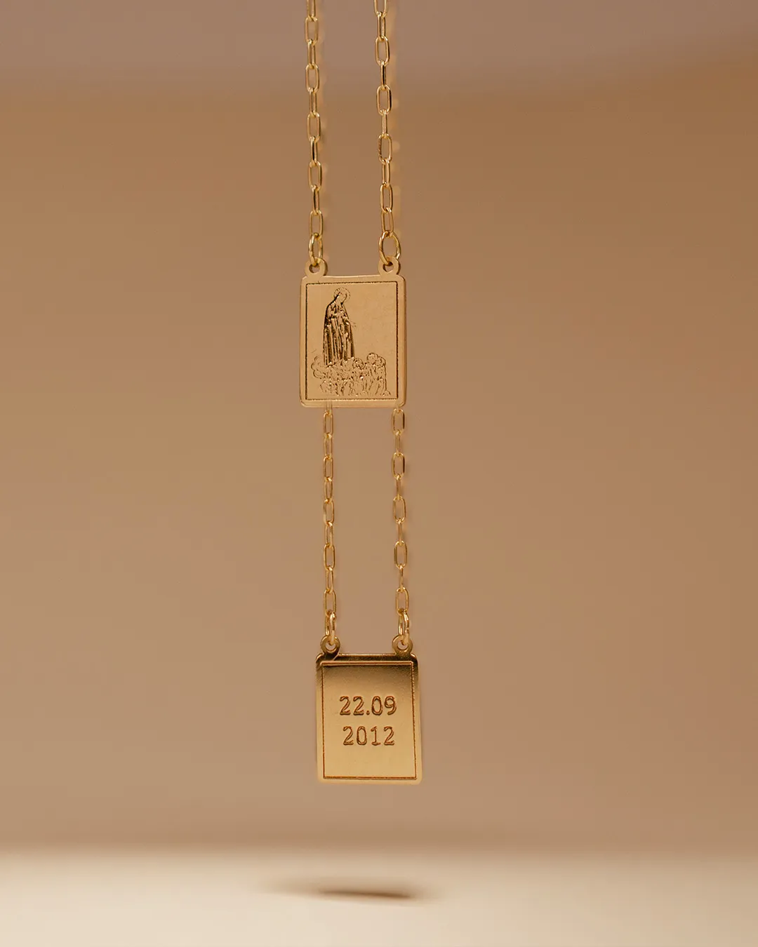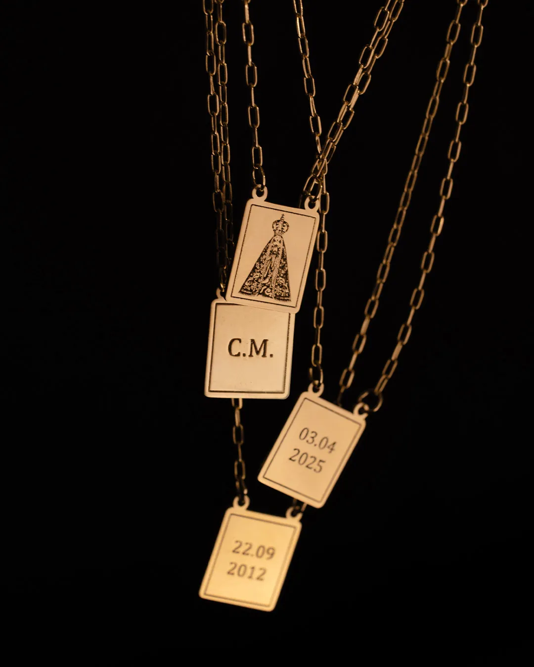 Escapulário em ouro amarelo ou branco 18k com plaquinhas em formato retangular e  gravações personalizadas em frente e verso. Corrente resistente estilo cartier.