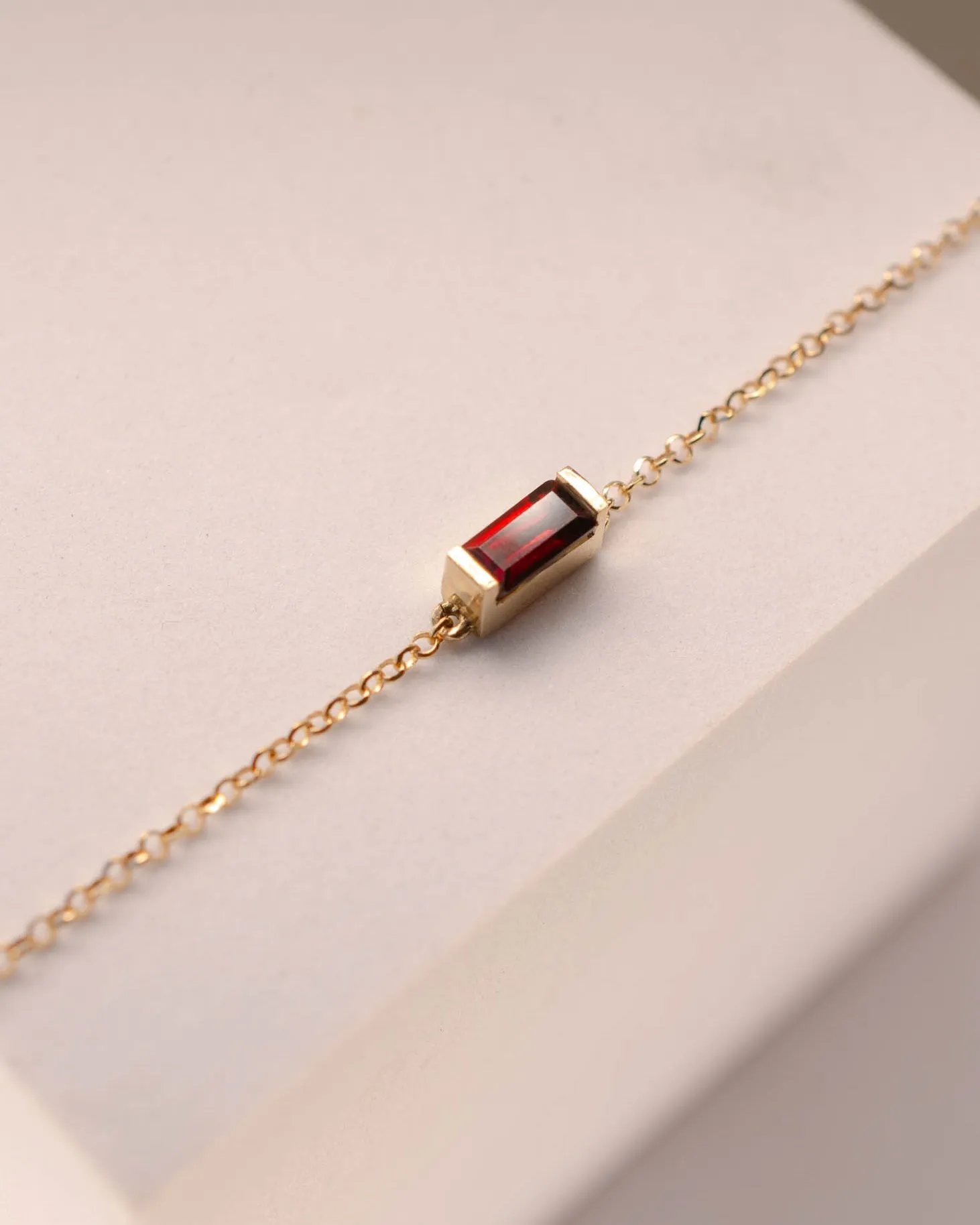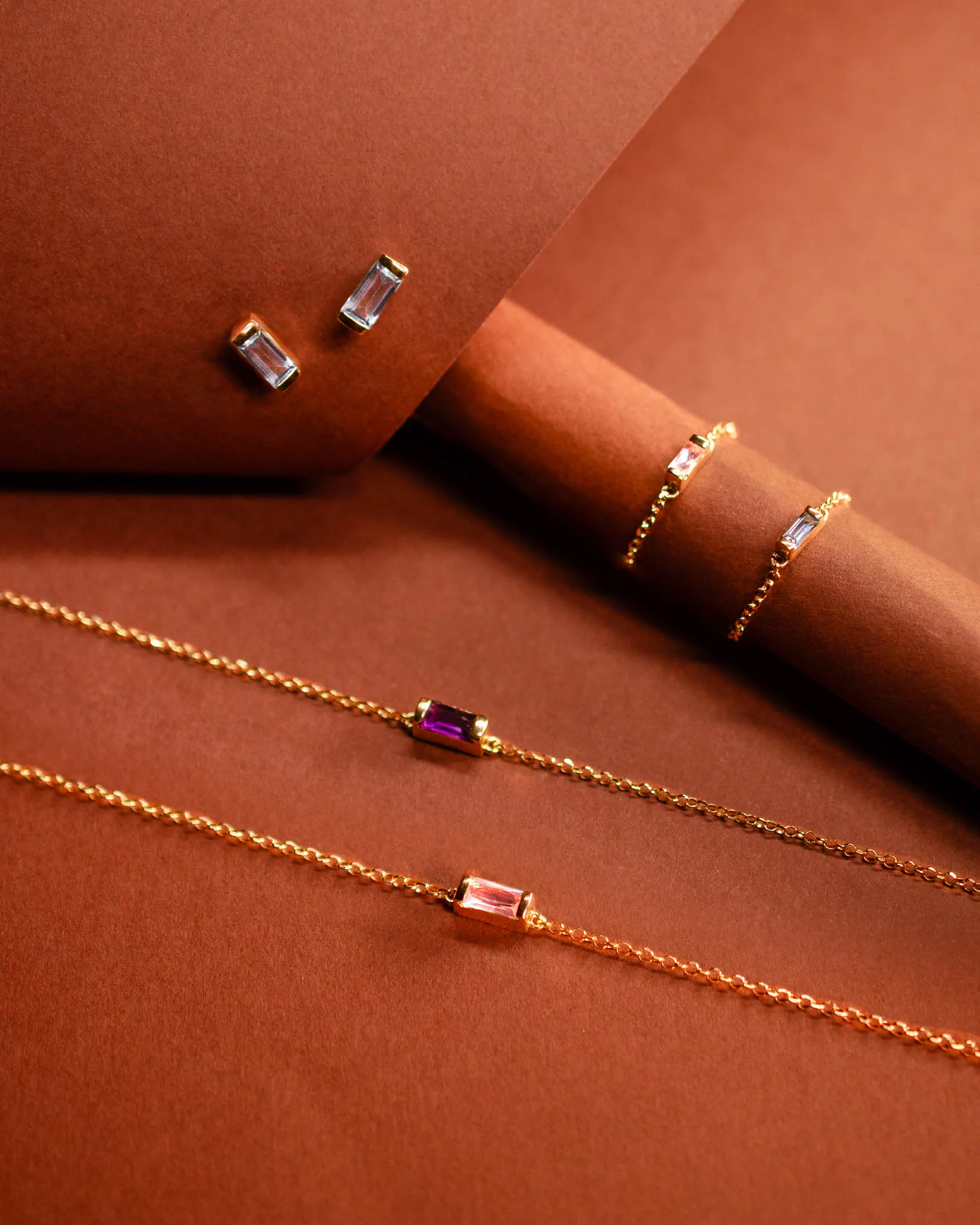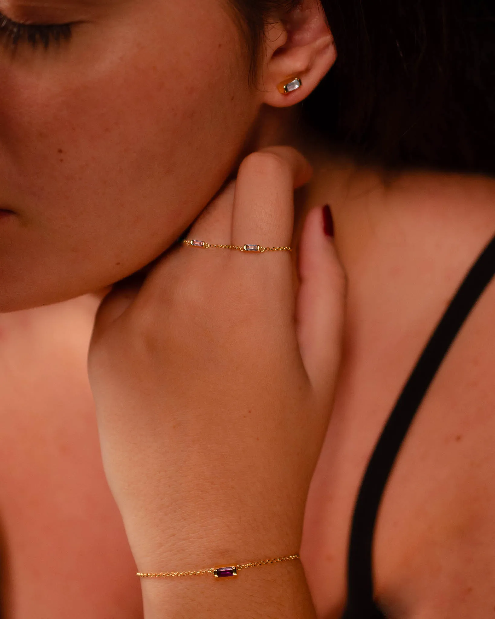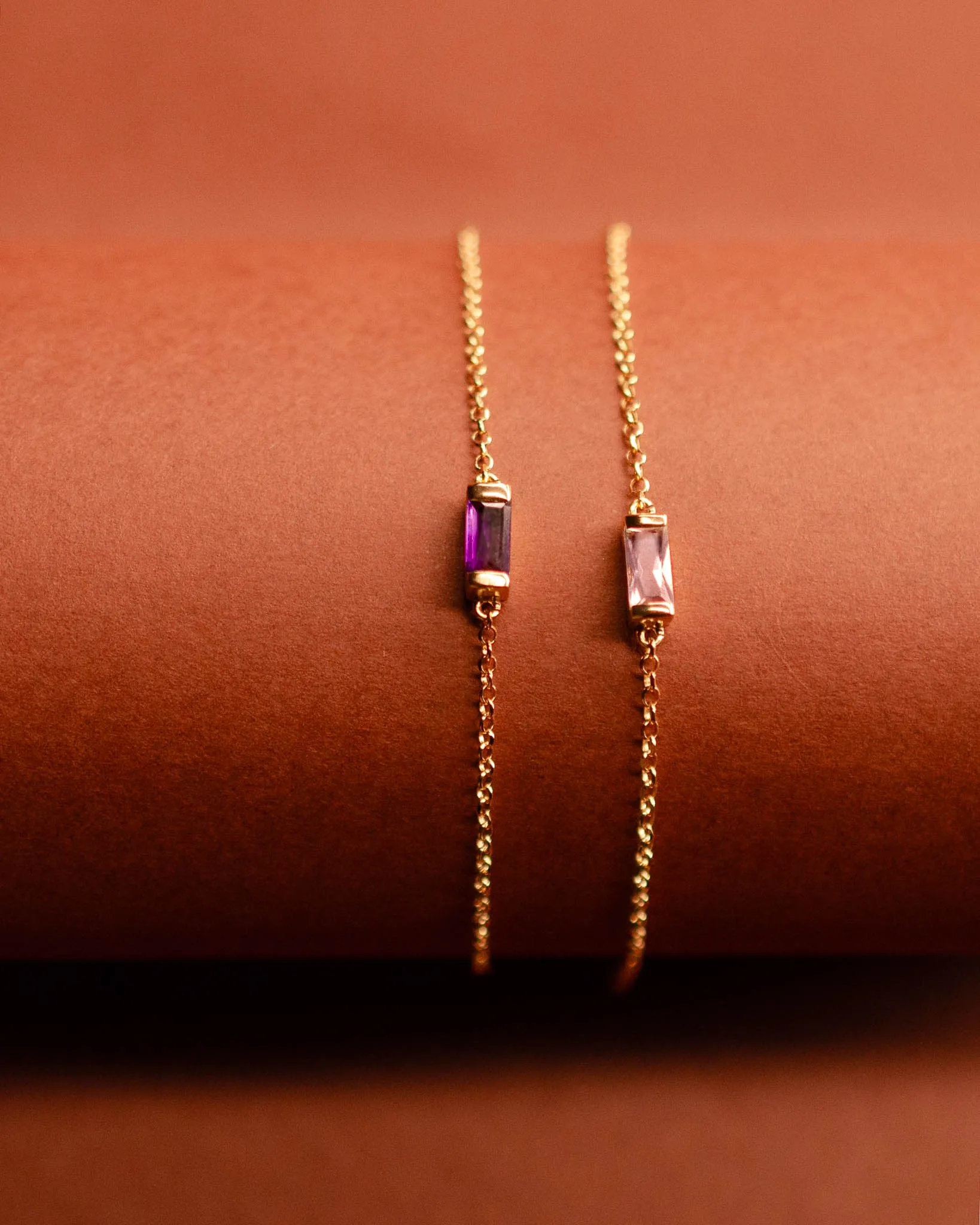Pulseira em ouro 18k, cravação de pedra natural com lapidação baguete e corrente elo português.