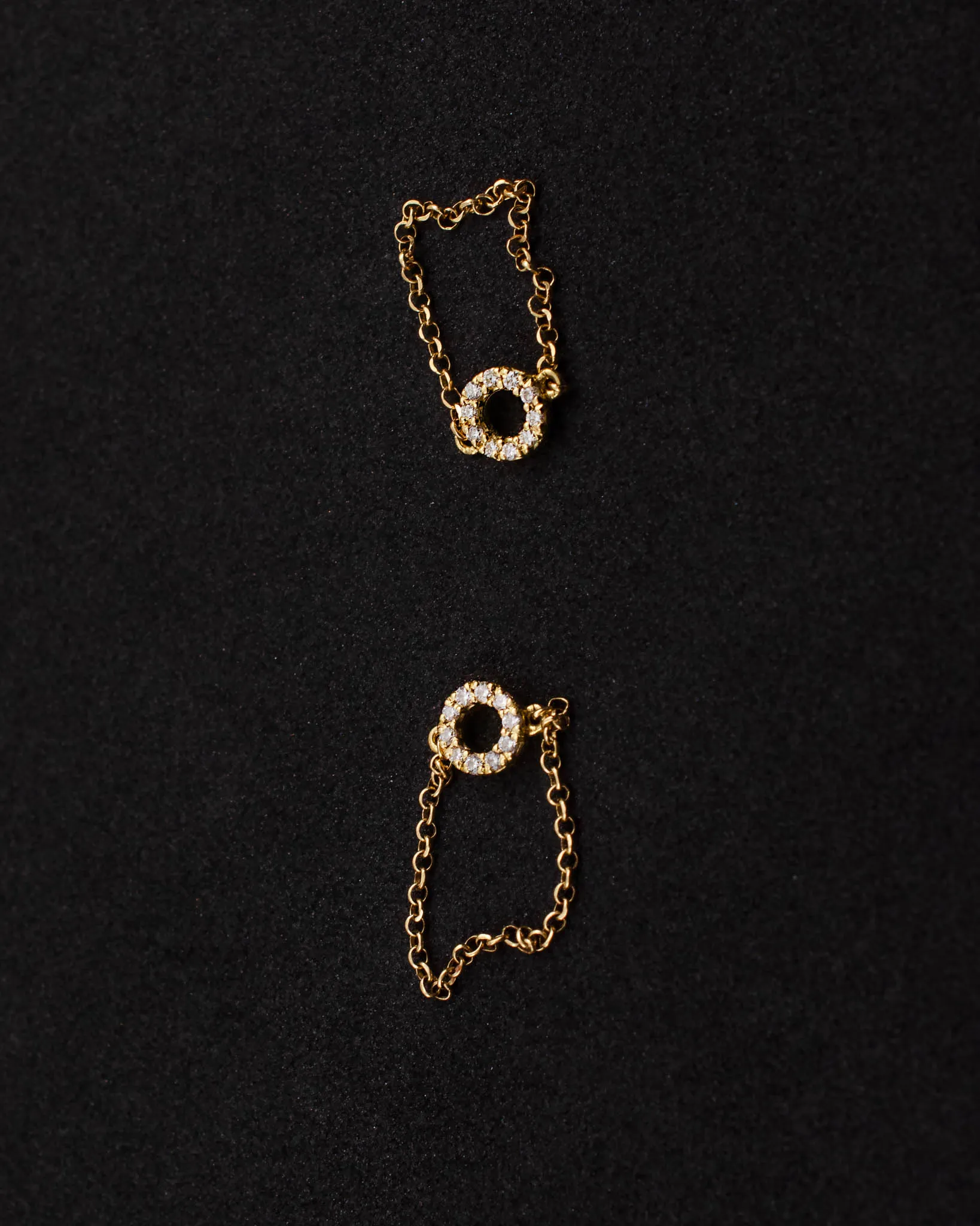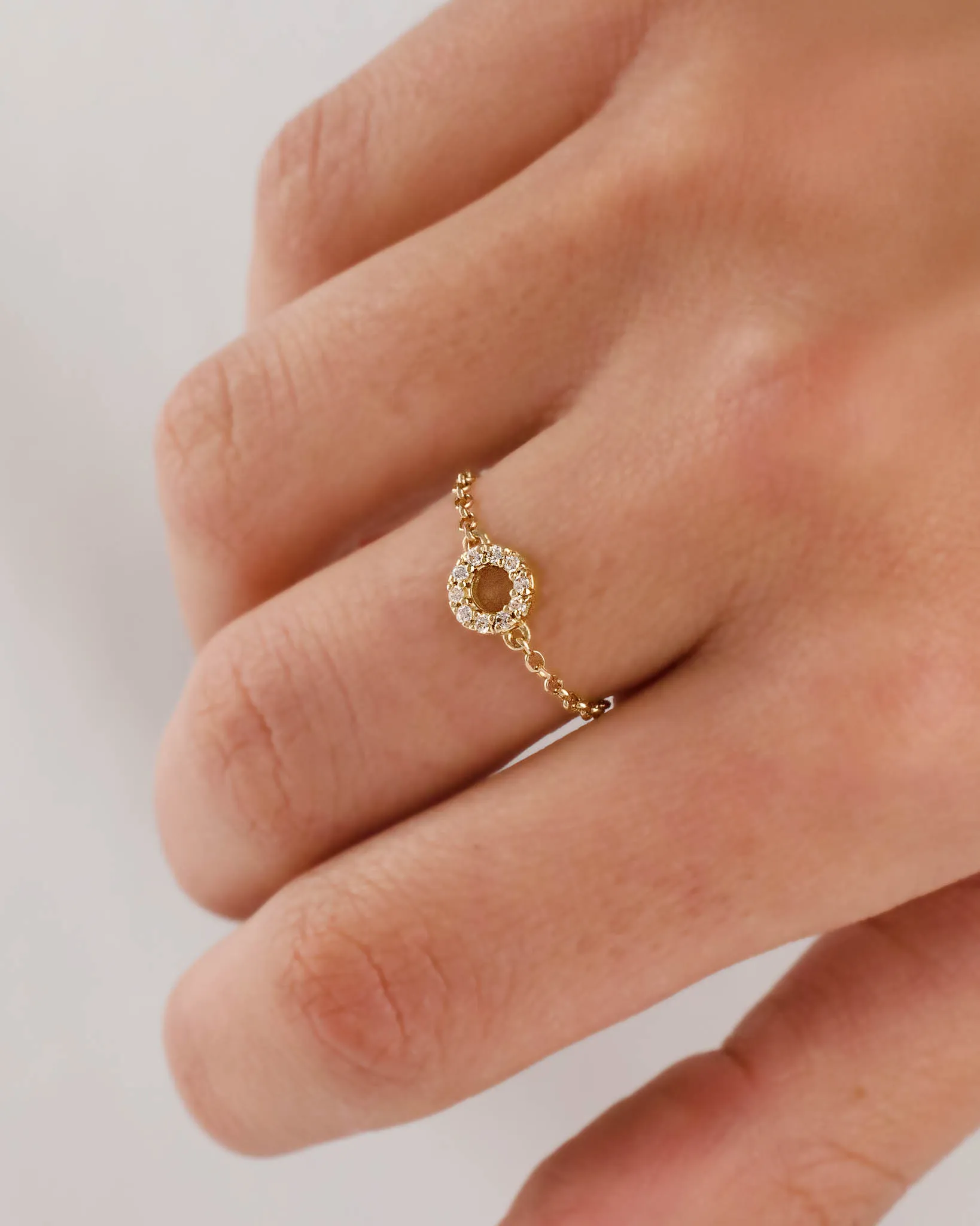 Anel em ouro 18k, configuração de aro, cravejado de 10 diamantes com 0,9 pts cada e corrente portuguesa em ouro 18k.