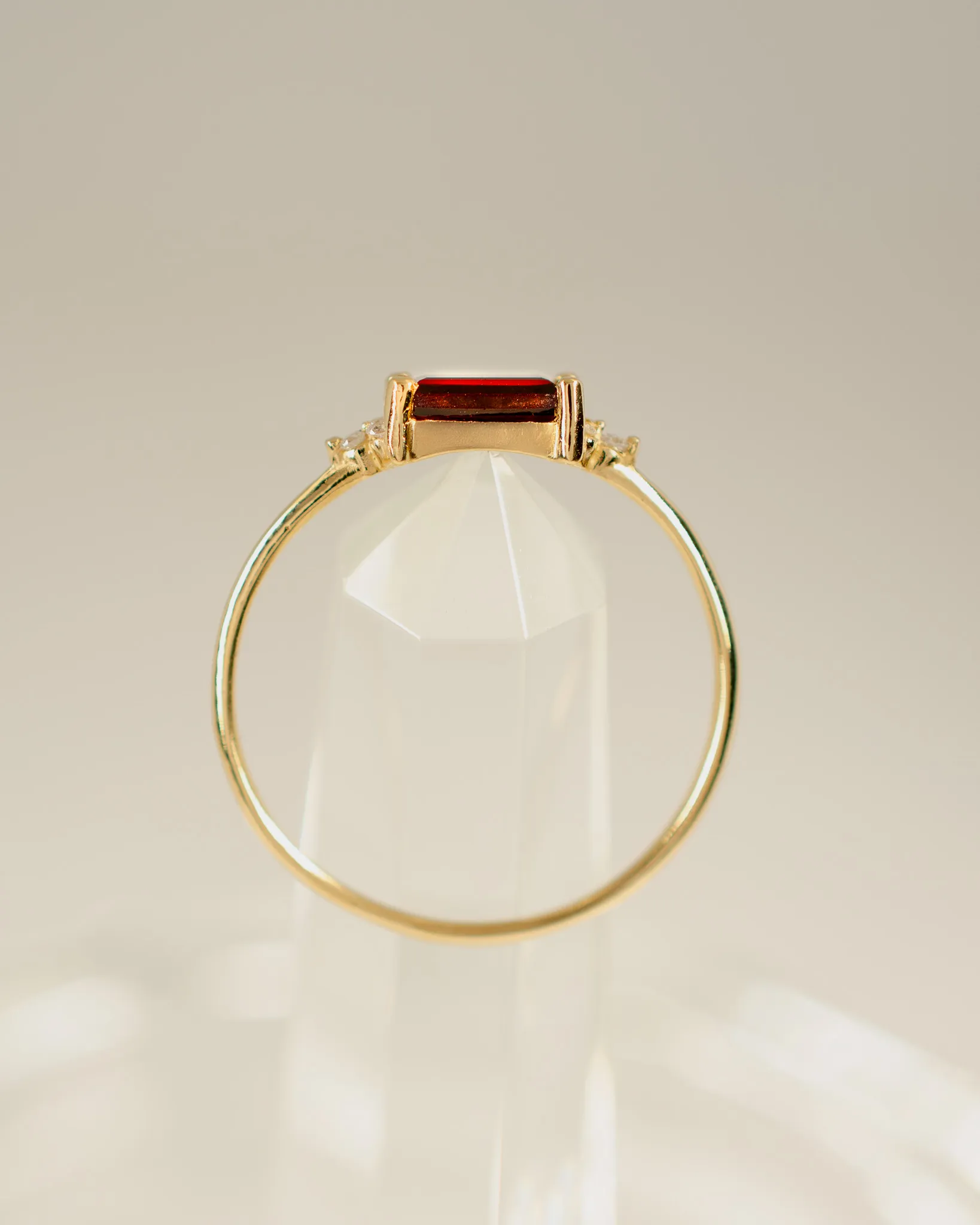 Anel em ouro 18k com seis diamantes de 0.6pts cada e granada em lapidação baguete.