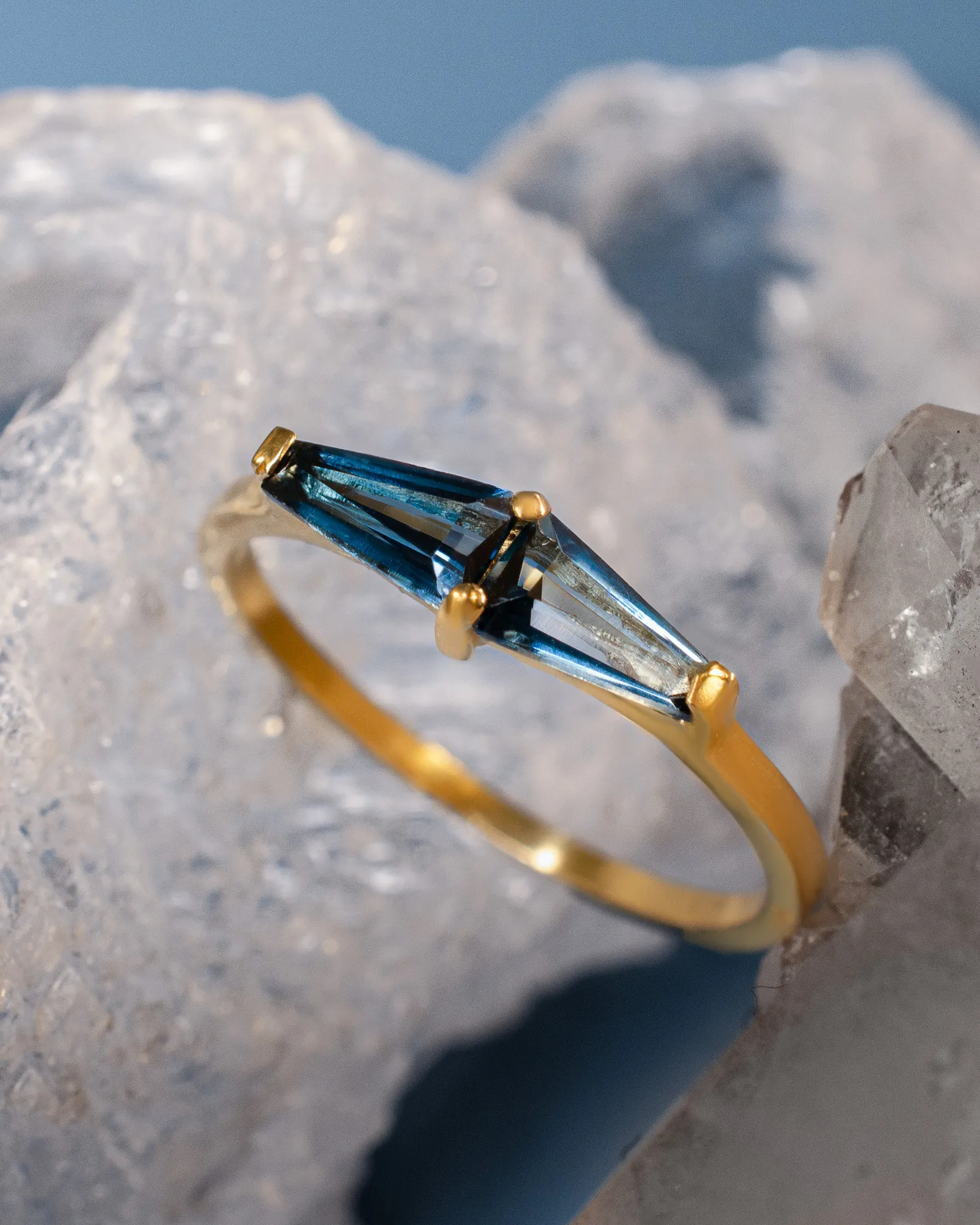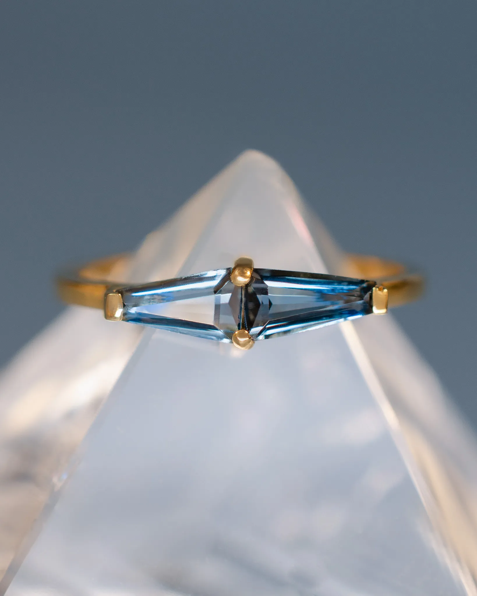 Anel em ouro amarelo 18k com topázio azul London, uma pedra conhecida pela profundidade do seu azul e pelo brilho que muda conforme a luz. O Shanti é um anel delicado, confortável e pensado para o dia a dia.