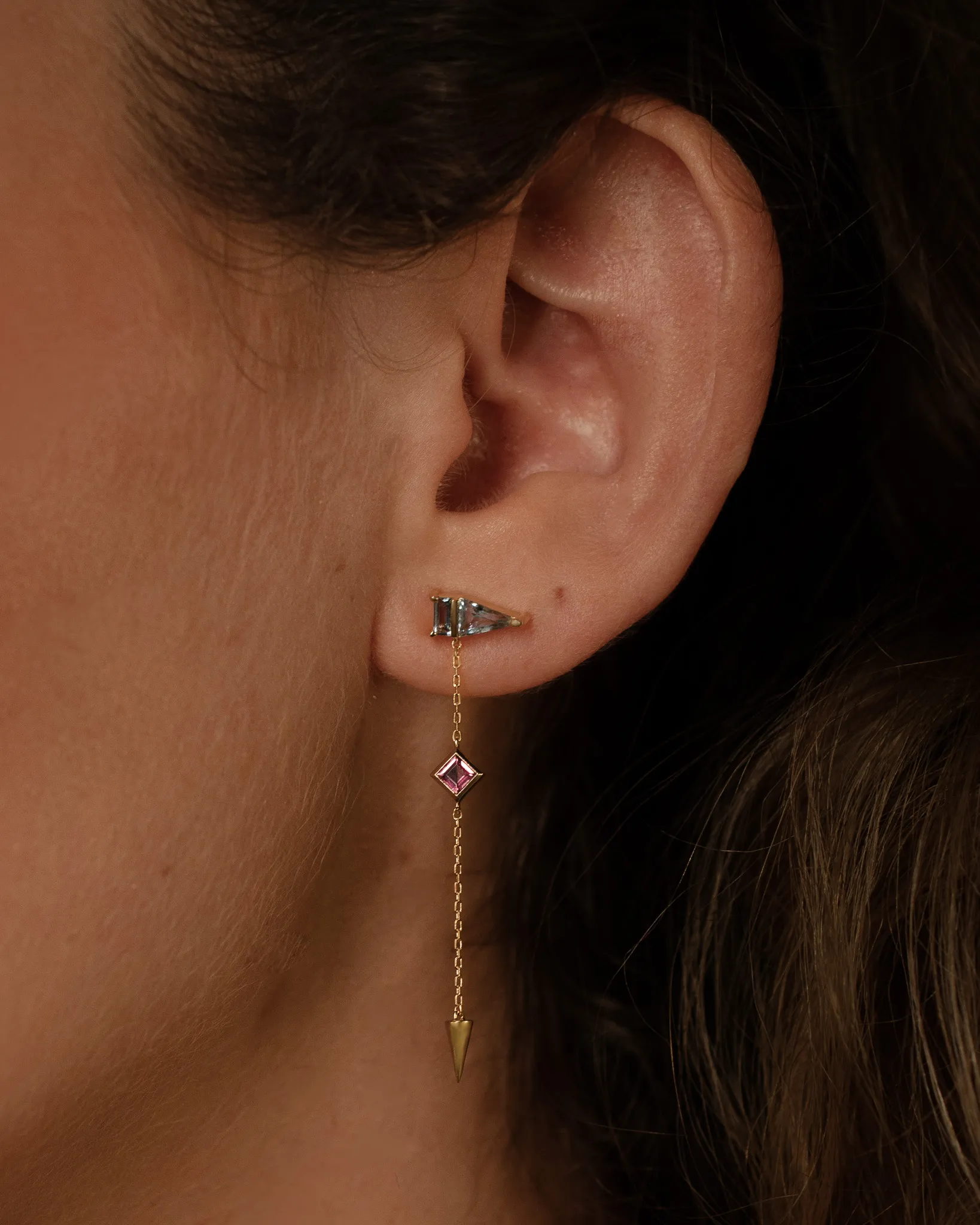 Brinco em ouro amarelo 18k com corrente fina e duas combinações possíveis de pedras: topázio azul com turmalina rosa ou peridoto com turmalina rosa.