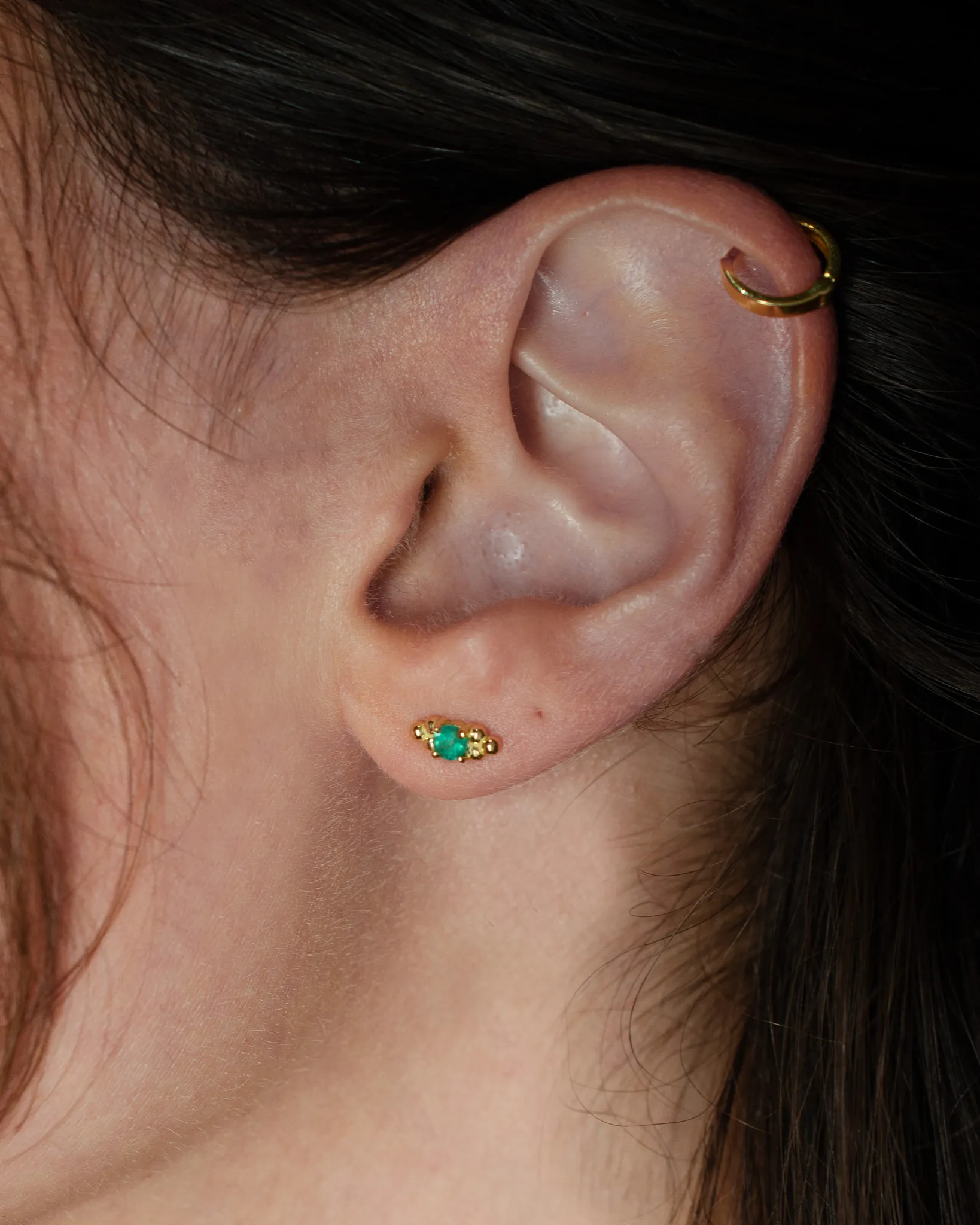 Brinco em ouro 18k com cravação de pedra natural, acompanha tarraxas de bebê em ouro 18k, ainda mais confortáveis e seguras.