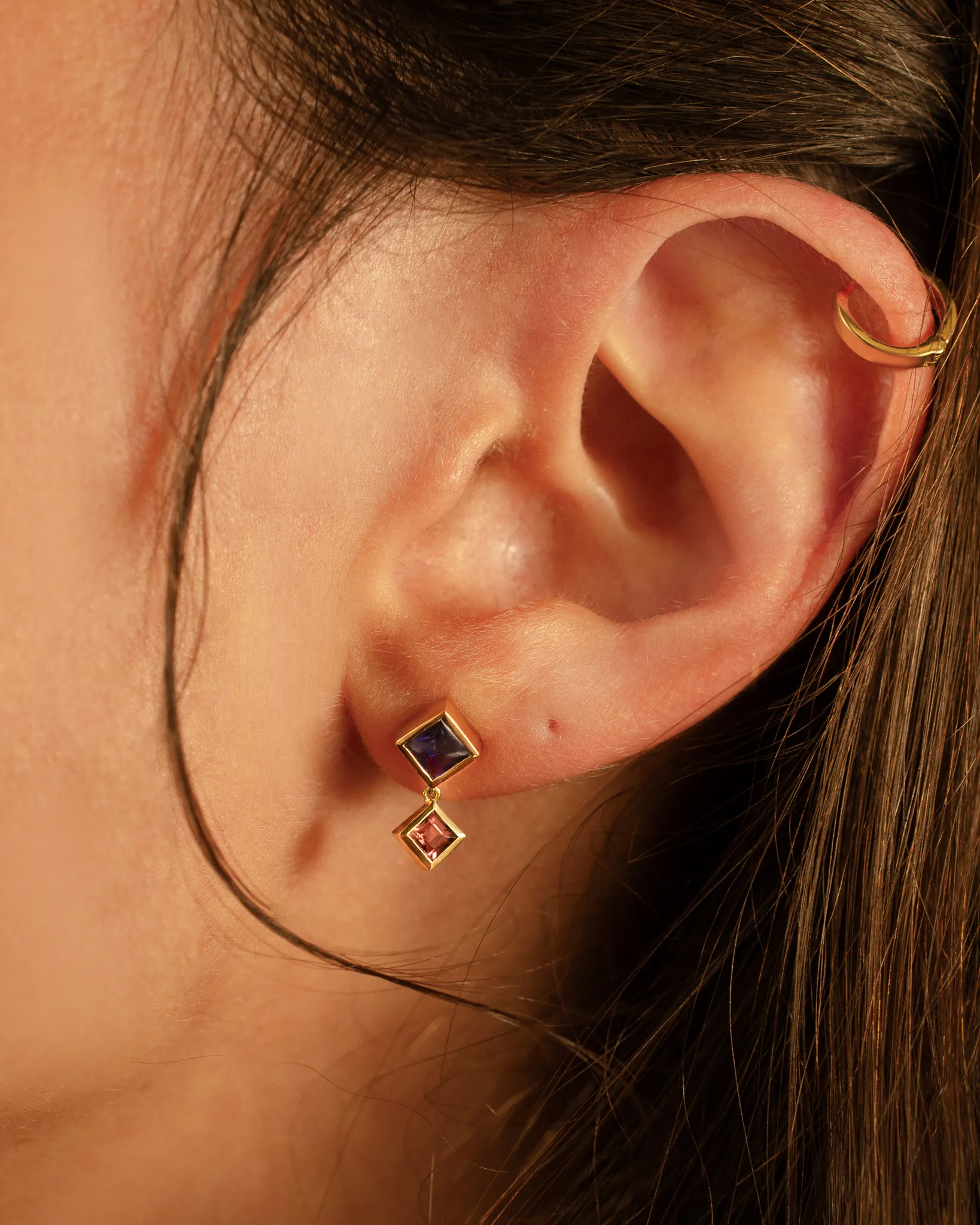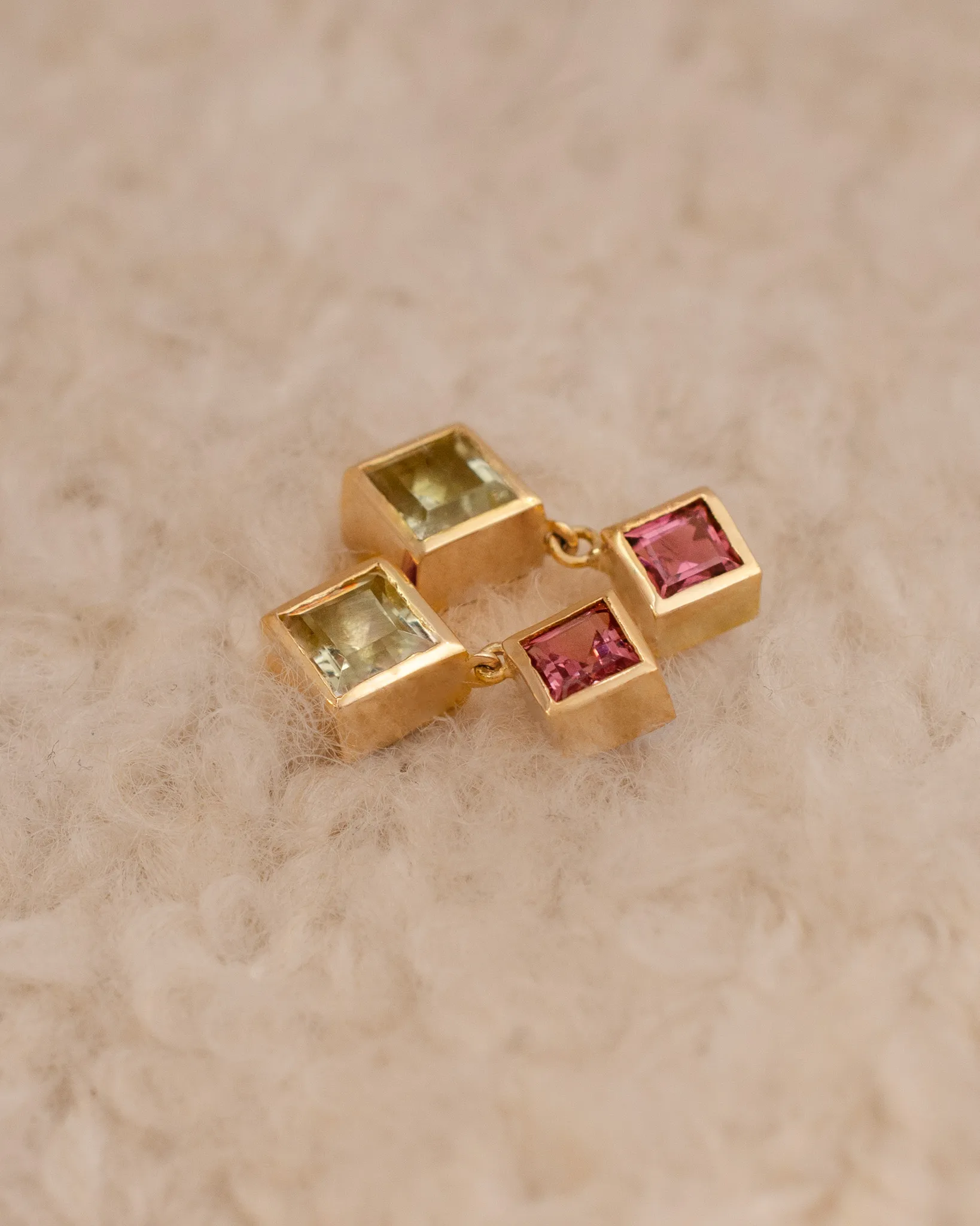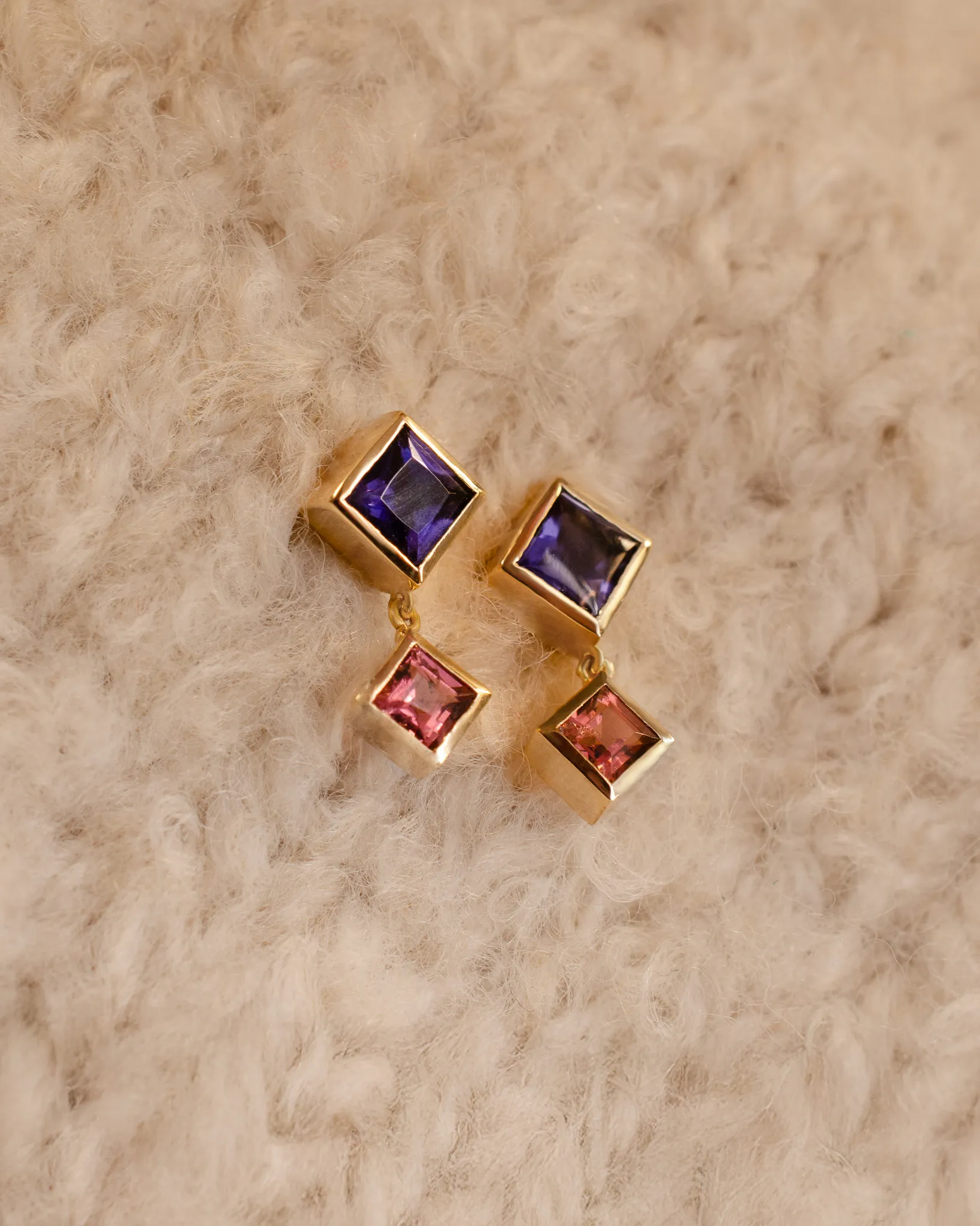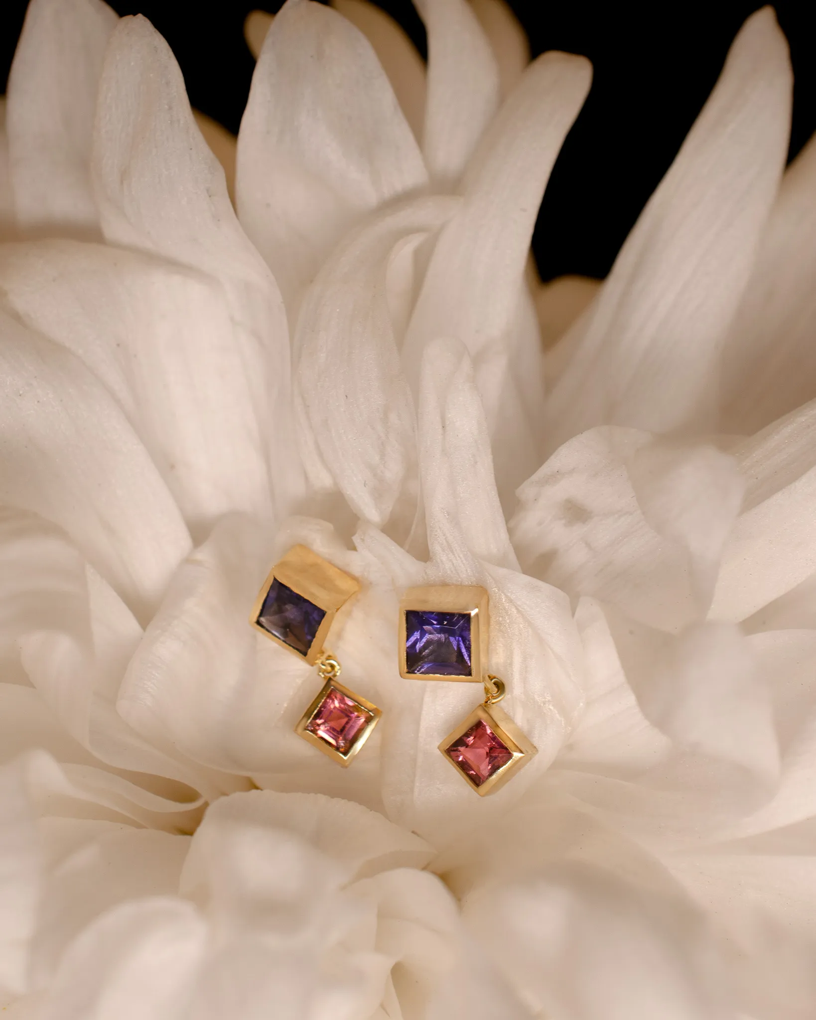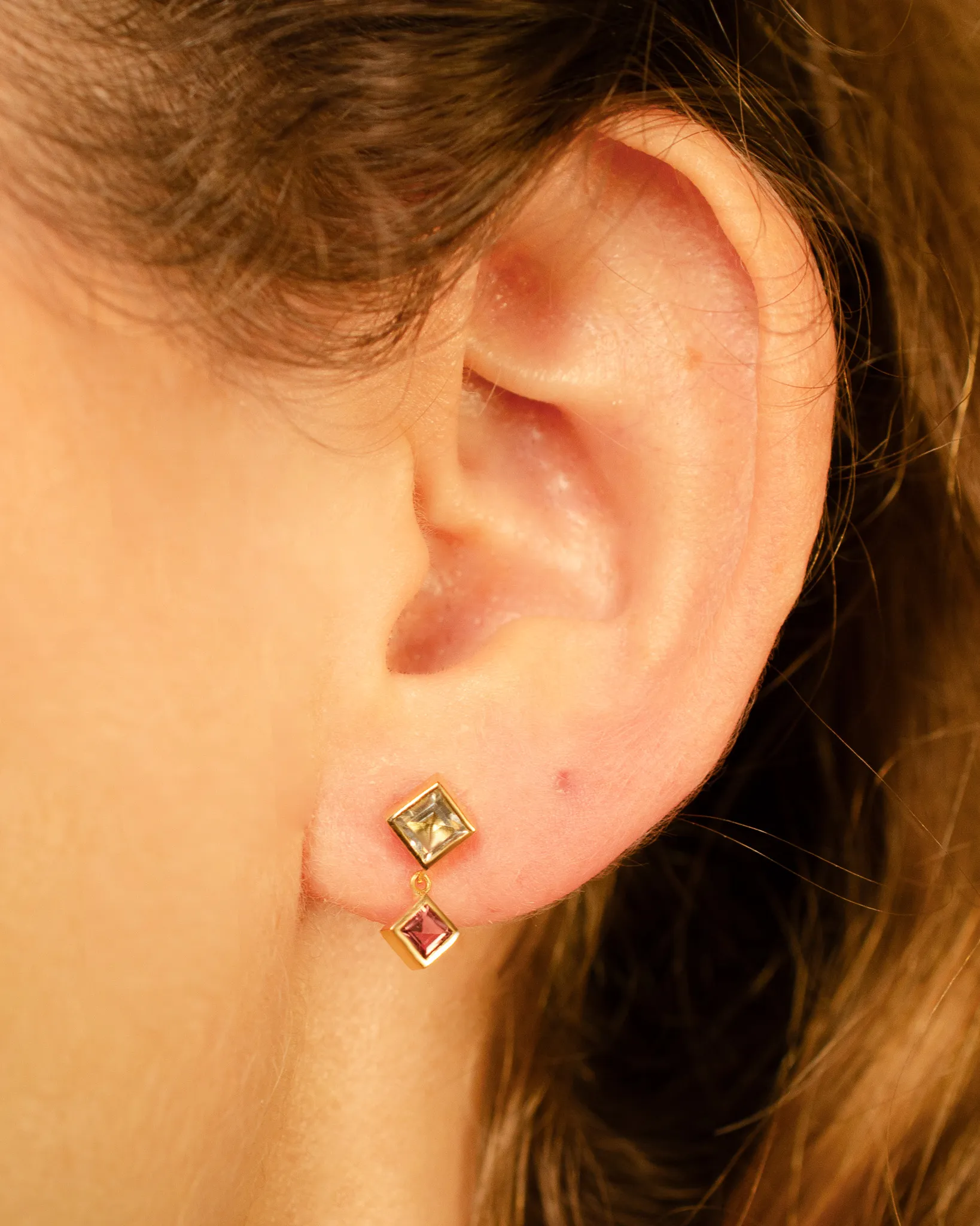 Brinco em ouro amarelo 18k em duas combinações possíveis de pedras: prasiolita com turmalina rosa ou iolita com turmalina rosa.