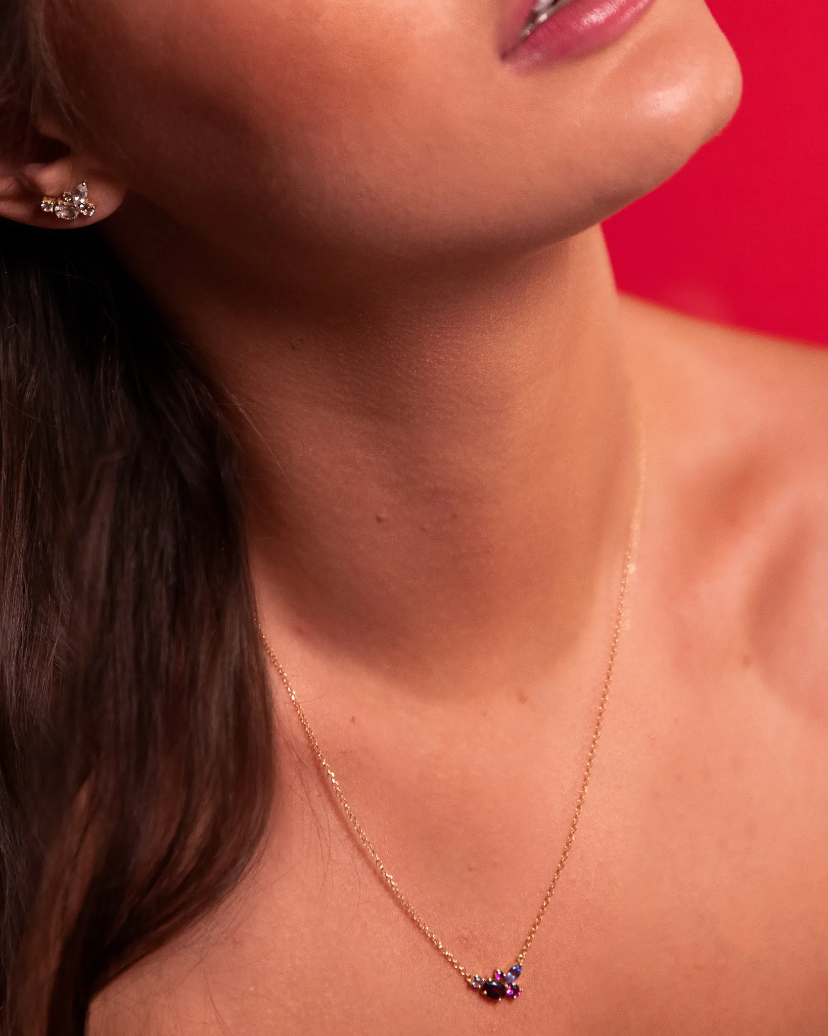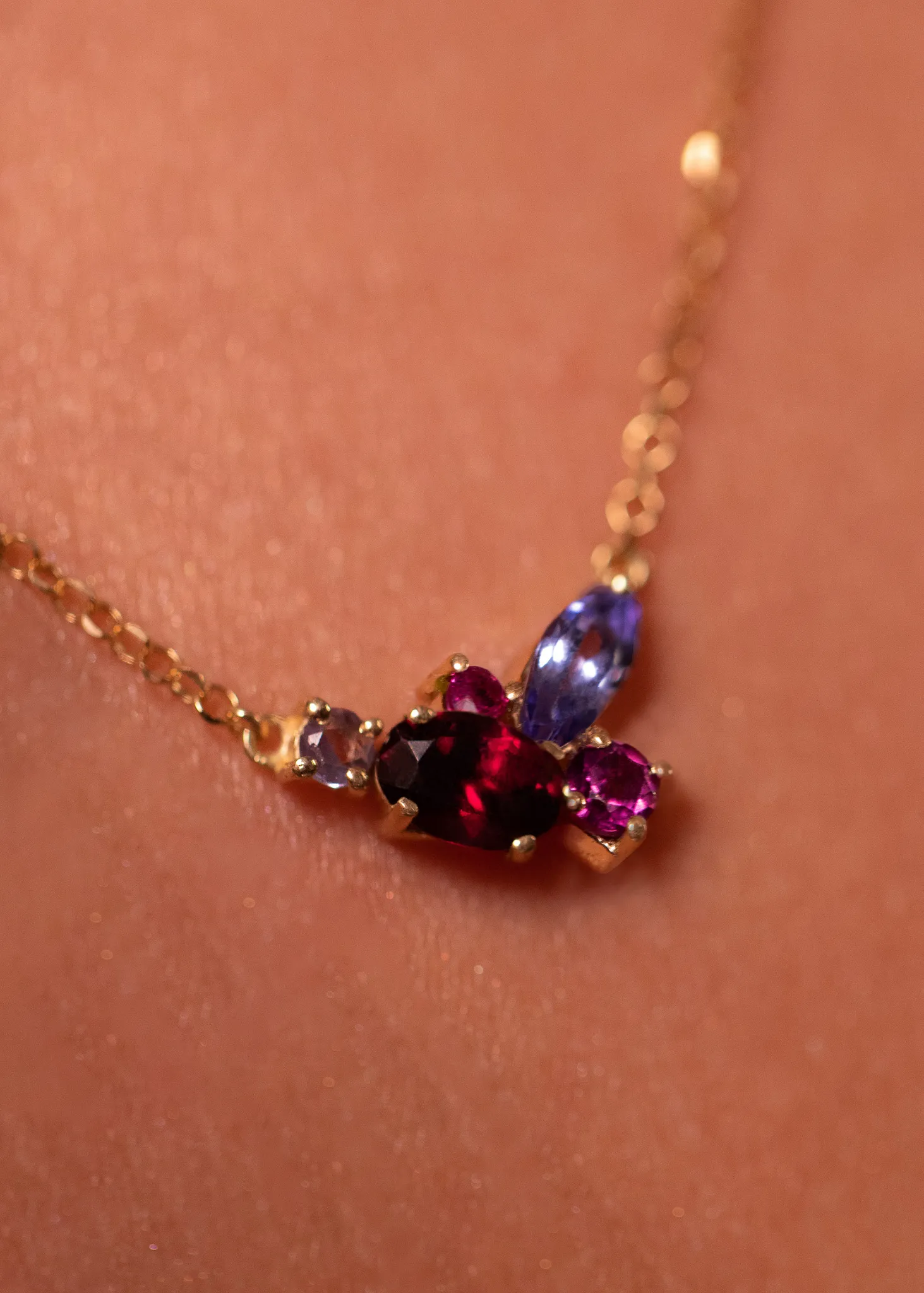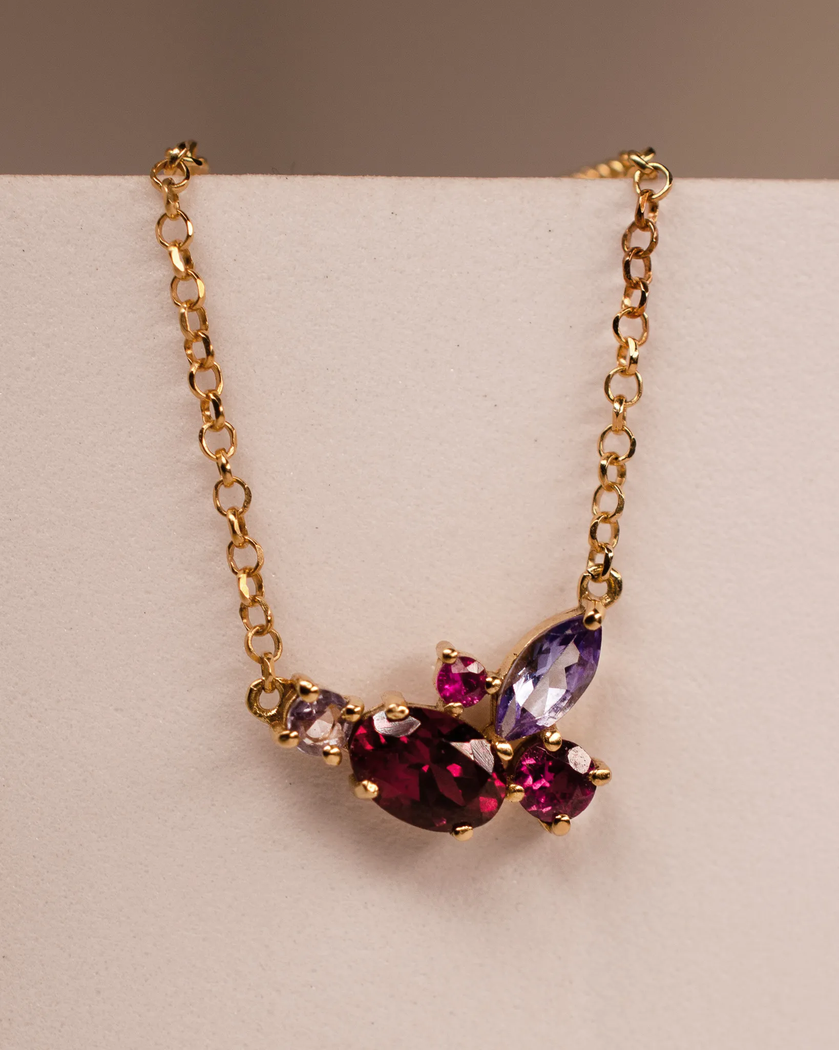 Pingente em ouro 18k cravejado com tanzanitas, rodolitas e rubi e corrente elo português de 60cm, regulável aos 50cm, em ouro 18k.