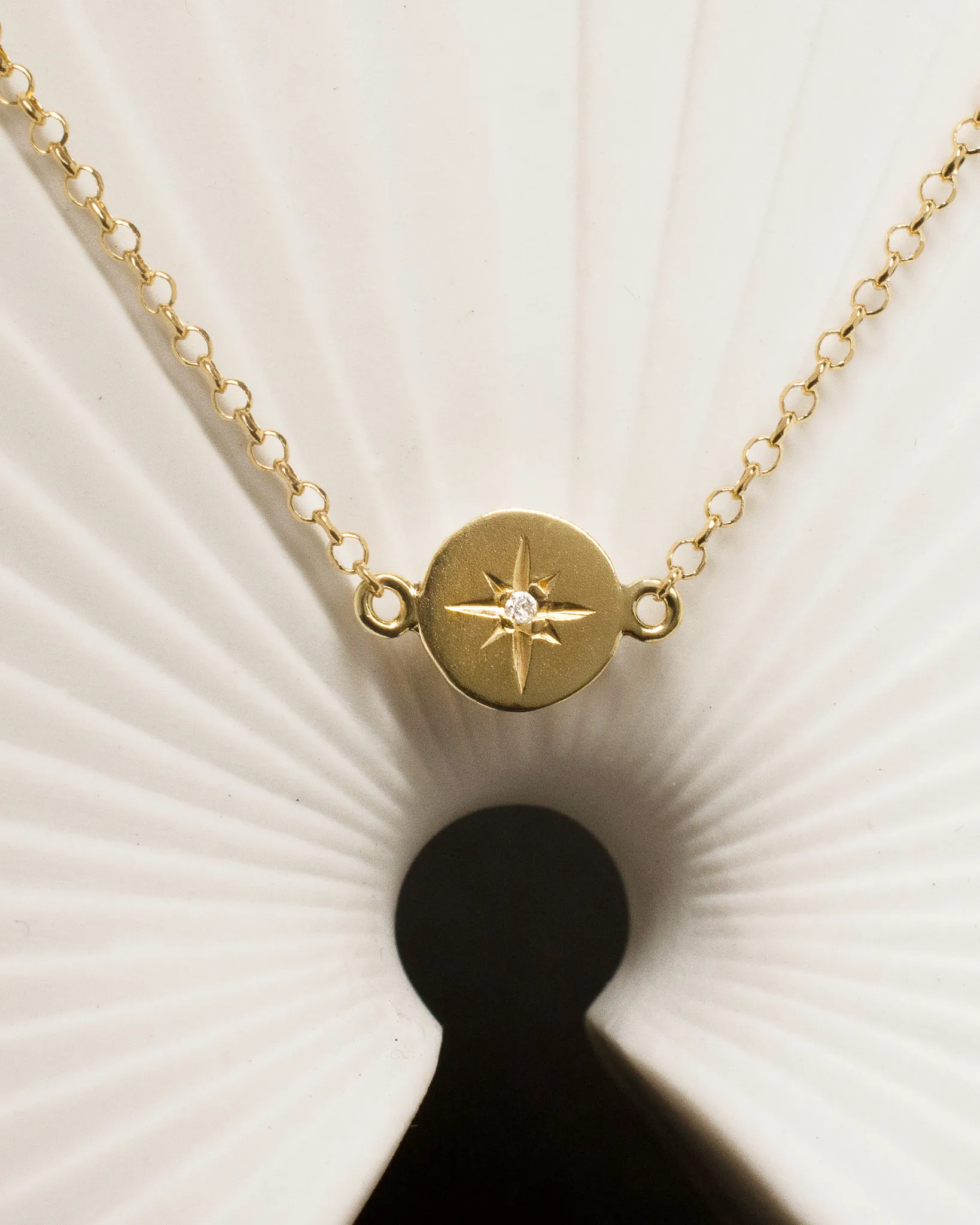 Pulseira com medalha Estrela Guia em ouro amarelo ou branco 18k e corrente elo português e diamante central.
